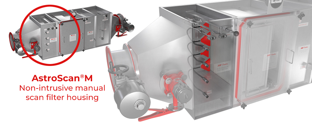 Until now, manual scan filtration validation has been done with an actuation rod that penetrates the pressure boundary of the filter housing, potentially allowing contaminants to escape the housing, putting the tester at risk of direct exposure. With the patented AstroScan M system, the actuation rod is located outside of the pressure boundary of the filter housing with no penetration of the pressure boundary.